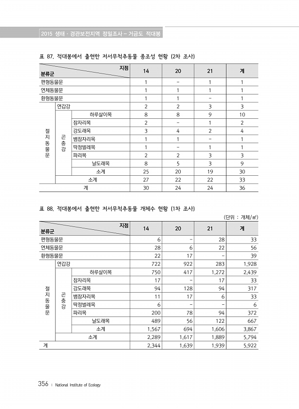 2015 생태·경관보전지역 정밀조사 거금도 적대봉 356 ? National Institute of Ecology 지점 분류군 14 20 21 계 편형동물문 1 1 1 연체동물문 1 1 1 1 환형동물문 1 1 1 절지동물문 연갑강 2 2 3 3 곤충강 하루살이목 8 8 9 10 잠자리목 2 1 2 강도래목 3 4 2 4 뱀잠자리목 1 1 1 딱정벌레목 1 1 1 파리목 2 2 3 3 날도래목 8 5 3 9 소계 25 20 19 30 소계 27 22 22 33 계 30 24 24 36 표 87. 적대봉에서 출현한 저서무척추동물 종조성 현황 2차 조사 지점 분류군 14 20 21 계 편형동물문 6 28 33 연체동물문 28 6 22 56 환형동물문 22 17 39 절지동물문 연갑강 722 922 283 1,9...