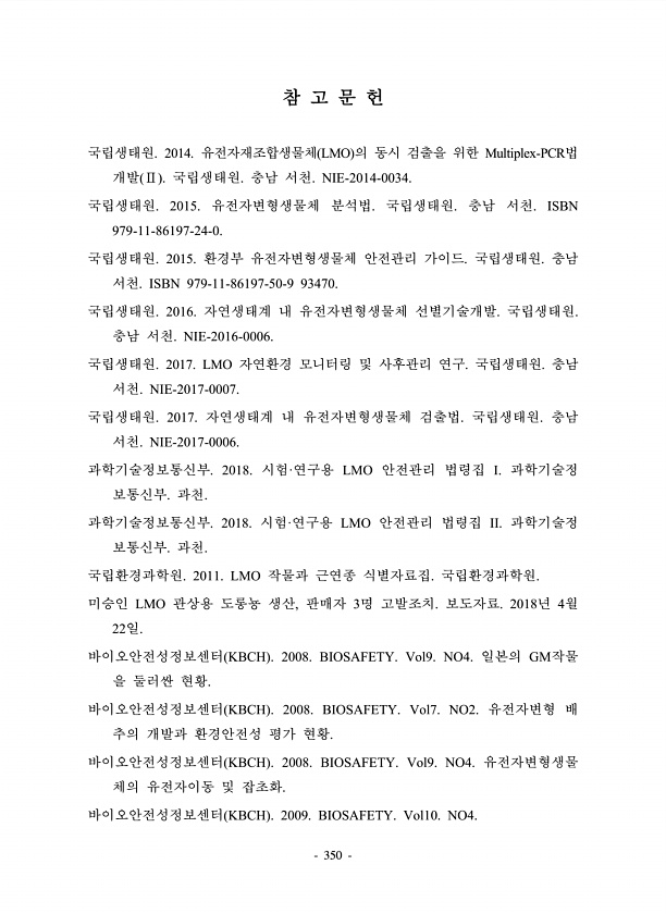 350 참 고 문 헌 국립생태원. 2014. 유전자재조합생물체 LMO 의 동시 검출을 위한 Multiplex-PCR법 개발 Ⅱ 국립생태원. 충남 서천. NIE-2014-0034. 국립생태원. 2015. 유전자변형생물체 분석법. 국립생태원. 충남 서천. ISBN 979-11-86197-24-0. 국립생태원. 2015. 환경부 유전자변형생물체 안전관리 가이드. 국립생태원. 충남 서천. ISBN 979-11-86197-50-9 93470. 국립생태원. 2016. 자연생태계 내 유전자변형생물체 선별기술개발. 국립생태원. 충남 서천. NIE-2016-0006. 국립생태원. 2017. LMO 자연환경 모니터링 및 사후관리 연구. 국립생태원. 충남 서천. NIE-2017-0007. 국립생태원. 2017. 자연생태계 내 ...