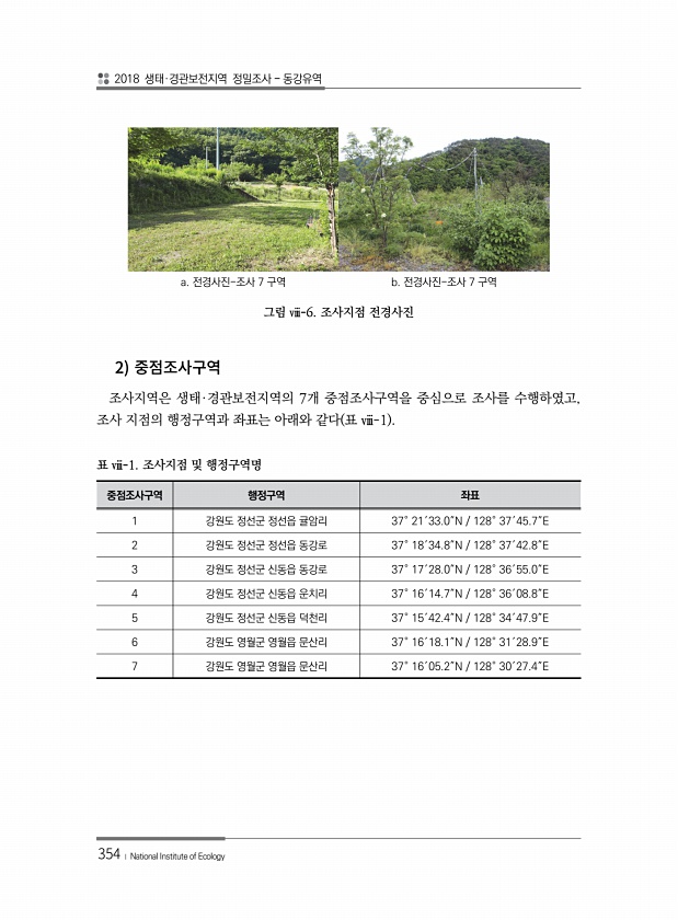 2018 생태·경관보전지역 정밀조사 동강유역 354 ? National Institute of Ecology a. 전경사진-조사 7 구역 b. 전경사진-조사 7 구역 그림 ⅷ-6. 조사지점 전경사진 2 조사지역은 생태·경관보전지역의 7개 중점조사구역을 중심으로 조사를 수행하였고, 조사 지점의 행정구역과 좌표는 아래와 같다 표 ⅷ-1 중점조사구역 행정구역 좌표 1 강원도 정선군 정선읍 귤암리 37° 21′33.0″N 128° 37′45.7″E 2 강원도 정선군 정선읍 동강로 37° 18′34.8″N 128° 37′42.8″E 3 강원도 정선군 신동읍 동강로 37° 17′28.0″N 128° 36′55.0″E 4 강원도 정선군 신동읍 운치리 37° 16′14.7″N 128° 36′08.8″E 5 강원도 정선군 ...