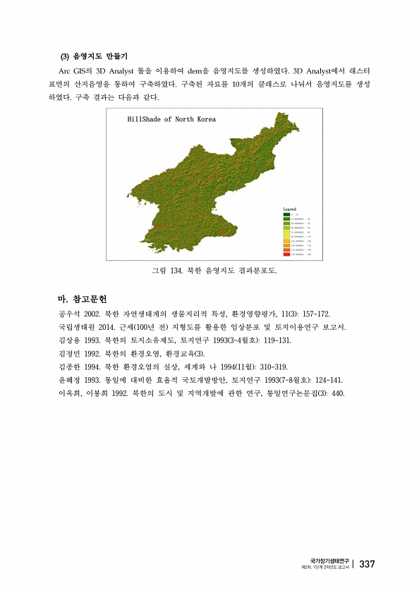 음영지도 만들기 의 툴을 이용하여 을 음영지도를 생성하였다 에서 래스터 표면의 산지음영을 통하여 구축하였다 구축된 자료를 개의 클래스로 나눠서 음영지도를 생성 하였다 구축 결과는 다음과 같다 그림 134. 북한 음영지도 결과분포도. 마 참고문헌 공우석 2002. 북한 자연생태계의 생물지리적 특성, 환경영향평가, 11 3 157-172. 국립생태원 2014. 근세 100년 전 지형도를 활용한 임상분포 및 토지이용연구 보고서. 김상용 1993. 북한의 토지소유제도, 토지연구 1993 34월호 119-131. 김정민 1992. 북한의 환경오염, 환경교육 3 김종한 1994. 북한 환경오염의 실상, 세계와 나 1994 11월 310-319. 윤혜정 1993. 통일에 대비한 효율적 국토개발방안, 토지연구 1993 7...