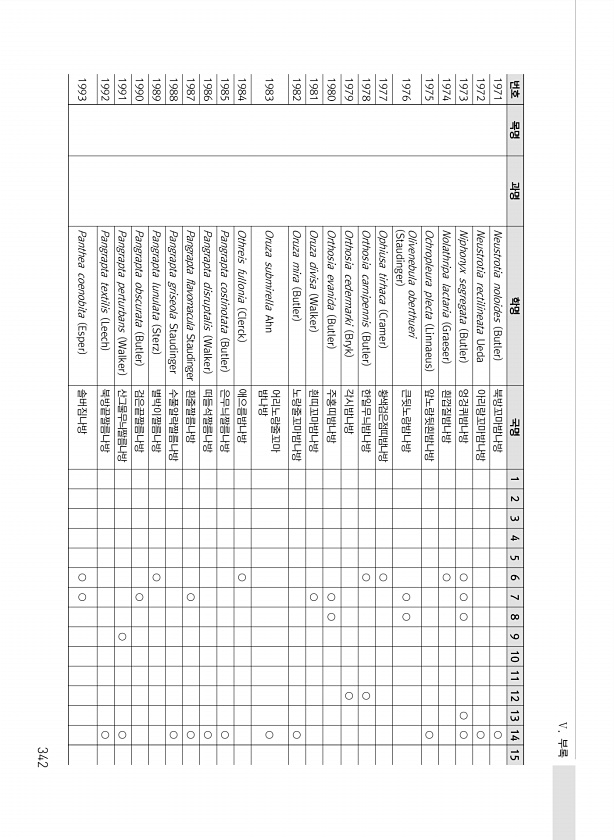 Ⅴ. 부록 342 번호 목명 과명 학명 국명 1 2 3 4 5 6 7 8 9 10 11 12 13 14 15 1971 Neustrotia noloides Butler 북방꼬마밤나방 ○ 1972 Neustrotia rectilineata Ueda 아리랑꼬마밤나방 ○ 1973 Niphonyx segregata Butler 엉겅퀴밤나방 ○ ○ ○ ○ ○ 1974 Nolathripa lactaria Graeser 흰껍질밤나방 ○ 1975 Ochropleura plecta Linnaeus 앞노랑뒷흰밤나방 ○ 1976 Olivenebula oberthueri Staudinger 큰뒷노랑밤나방 ○ ○ 1977 Ophiusa tirhaca Cramer 황색검은점띠밤나방 ○ 1978 Orthosia carnipennis B...