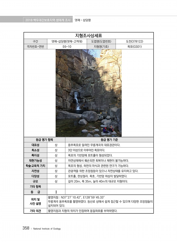 2018 백두대간보호지역 생태계 조사 댓재 삽당령 358 ? National Institute of Ecology 지형조사상세표 구간 댓재삽당령 댓재고적대 도엽명 도엽번호 도전 378122 격자번호-연번 E6-10 지형명 기호 폭포 GS01 등급 평가 항목 등급 평가 기준 대표성 상 용추폭포로 알려진 무릉계곡의 대표경관이다. 희소성 상 3단 이상으로 이루어진 폭포이다. 특이성 상 폭포의 기반암에 포트홀이 형성되었다. 재현가능성 상 자연상태에서 훼손되면 회복이나 재현이 불가능하다. 학술?교육적 가치 상 폭포의 형성, 하천의 마식과 관련된 연구가 가능하다. 자연성 상 관광객을 위한 조망점등이 있으나 자연상태를 유지하고 있다. 다양성 상 포트홀, 판상절리. 폭호, 기반암 하상이 발달하였다. 규모 상 길이 20m,...