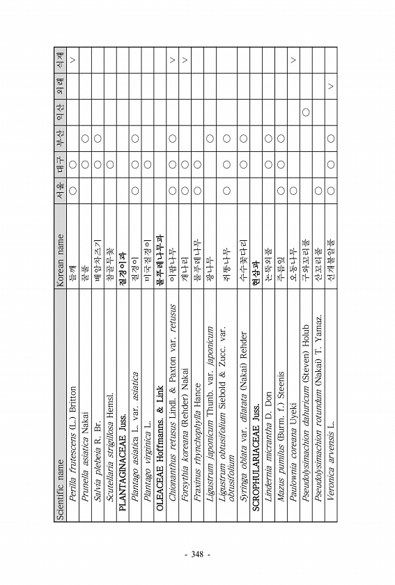 Scientific name Korean name 서울 대구 부산 익산 외래 식재 Perilla frutescens L. Britton 들깨 ○ ○ ∨ Prunella asiatica Nakai 꿀풀 ○ ○ Salvia plebeia R. Br. 배암차즈기 ○ ○ Scutellaria strigillosa Hemsl. 참골무꽃 ○ PLANTAGINACEAE Juss. 질경이과 Plantago asiatica L. var. asiatica 질경이 ○ ○ ○ Plantago virginica L. 미국질경이 ○ OLEACEAE Hoffmanns. & Link 물푸레나무과 Chionanthus retusus Lindl. & Paxton var. retusus 이팝나무...