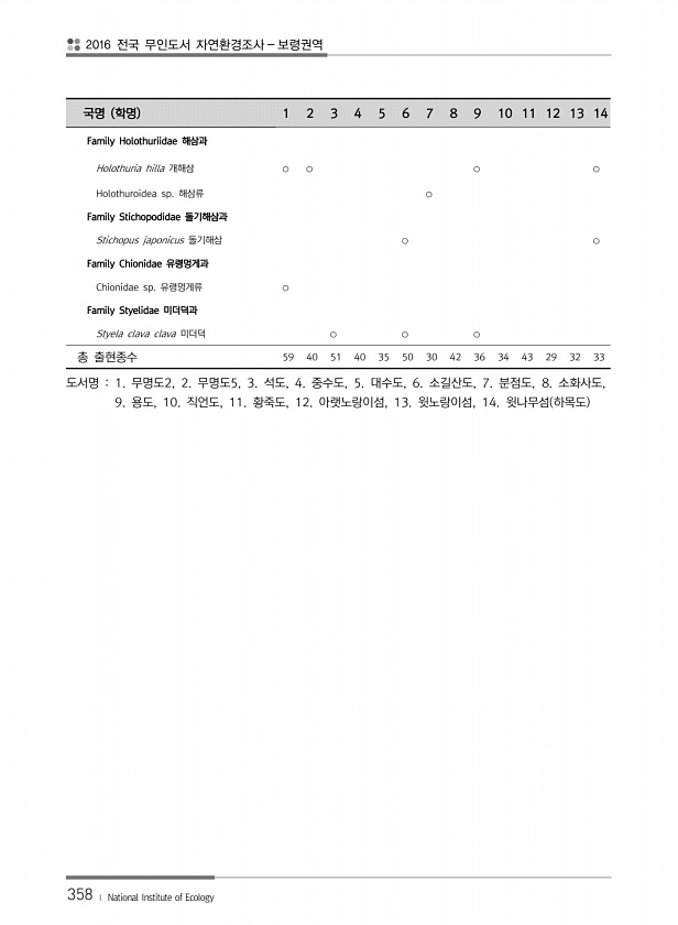 2016 전국 무인도서 자연환경조사 보령권역 358 ? National Institute of Ecology 국명 학명 1 2 3 4 5 6 7 8 9 10 11 12 13 14 Family Holothuriidae 해삼과 Holothuria hilla 개해삼 ○ ○ ○ ○ Holothuroidea sp. 해삼류 ○ Family Stichopodidae 돌기해삼과 Stichopus japonicus 돌기해삼 ○ ○ Family Chionidae 유령멍게과 Chionidae sp. 유령멍게류 ○ Family Styelidae 미더덕과 Styela clava clava 미더덕 ○ ○ ○ 총 출현종수 59 40 51 40 35 50 30 42 36 34 43 29 32 33 도서명 1. 무명도2, 2. 무명도5,...