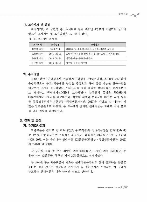 선 태 식 물 National Institute of EcologyⅠ357 나. 조사시기 및 일정 조사시기는 각 구간별 총 12차례에 걸쳐 2016년 4월부터 10월까지 실시하 였으며 조사지역 및 조사일정은 표 106과 같다. 조사지역 조사일정 조사경로 희양산 지역 2016. 7. 7 이화령터널황학산백화산이만봉시루봉분지제 조령산 지역 2016. 10. 26 조령산자연휴양림산림욕장깃대봉조령산이화령터널 주흘산 지역 2016. 10. 24 혜국사주봉주흘산혜국사 투구봉 지역 2016. 10. 23 저수령문복대저수령 표 106. 조사지역 및 일정 다. 분석방법 제4차 전국자연환경조사 식물상지침 환경부·국립생태원, 2014 에 의거하여 수행하였으며 주로 백두대간 능선을 중심으로 하여 접근 가능한 양쪽사면을 대상으로 조...