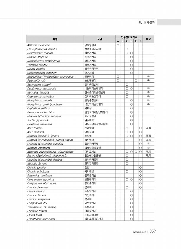 Ⅱ. 조사결과 www.nie.re.kr ? 359 학명 국명 민통선이북지역 비고 A B C D E F Allecula melanaria 왕썩덩벌레 ○ Plesiophthalmus davidis 산맴돌이거저리 ○ Heterotarsus carinula 강변거저리 ○ ○ Blindus strigosus 제주거저리 ○ Derosphaerus subviolaceus 보라거저리 ○ Tenebrio molitor 갈색거저리 ○ Uloma bonzica 뿔우묵거저리 ○ Gonocephalum japanum 애거저리 ○ Hydrophilus Hydrophilus acuminatus 물땡땡이 ○ 국 Pyrocoelia rufa 늦반딧불이 ○ ○ 국 Apteroloma kozlovi 먼지송장벌레 ○ Dendroxena sex...