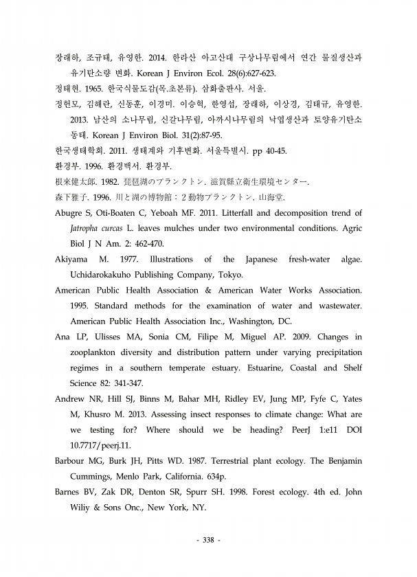 338 장래하, 조규태, 유영한. 2014. 한라산 아고산대 구상나무림에서 연간 물질생산과 유기탄소량 변화. Korean J Environ Ecol. 28 6 627-623. 정태현. 1965. 한국식물도감 목.초본류 삼화출판사. 서울. 정헌모, 김해란, 신동훈, 이경미. 이승혁, 한영섭, 장래하, 이상경, 김태규, 유영한. 2013. 남산의 소나무림, 신갈나무림, 아까시나무림의 낙엽생산과 토양유기탄소 동태. Korean J Environ Biol. 31 2 87-95. 한국생태학회. 2011. 생태계와 기후변화. 서울특별시. pp 40-45. 환경부. 1996. 환경백서. 환경부. 根來健太?. 1982. 琵琶湖のプランクトン. 滋賀?立衛生環境センタ?. 森下雅子. 1996. 川と湖の博物館:2動物プランクトン. ...