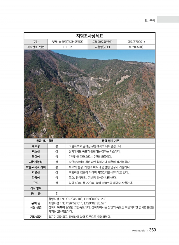 Ⅲ. 부록 www.nie.re.kr ? 359 지형조사상세표 구간 댓재삽당령 댓재고적대 도엽명 도엽번호 미로 379091 격자번호-연번 E1-02 지형명 기호 폭포 GS01 등급 평가 항목 등급 평가 기준 대표성 상 그림폭포로 알려진 무릉계곡의 대표경관이다. 희소성 상 산지에서도 폭포가 출현하는 경우는 희소하다. 특이성 상 기반암을 따라 흐르는 2단의 와폭이다. 재현가능성 상 자연상태에서 훼손되면 회복이나 재현이 불가능하다. 학술?교육적 가치 상 폭포의 형성, 하천의 마식과 관련된 연구가 가능하다. 자연성 상 위험하고 접근이 어려워 자연상태를 유지하고 있다. 다양성 상 폭호, 판상절리, 기반암 하상이 나타난다. 규모 상 길이 40m, 폭 220m, 높이 150m의 대규모 지형이다. 기타 항목 등 급 Ⅰ 위치...
