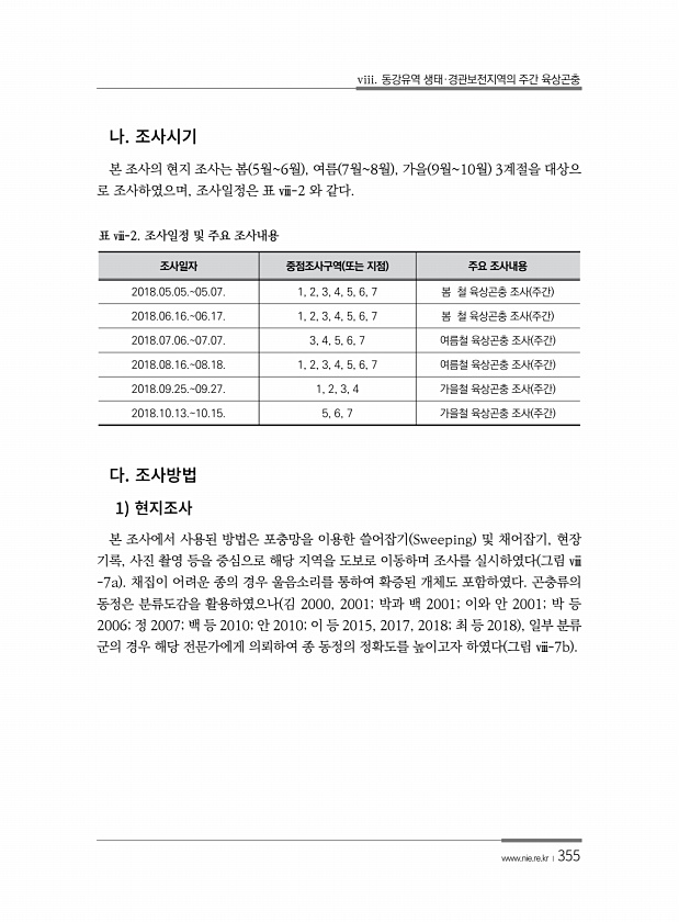 viii. 동강유역 생태·경관보전지역의 주간 육상곤충 www.nie.re.kr ?355 본 조사의 현지 조사는 봄 5월6월 , 여름 7월8월 , 가을 9월10월 3계절을 대상으 로 조사하였으며, 조사일정은 표 ⅷ-2 와 같다. 조사일자 중점조사구역 또는 지점 주요 조사내용 2018.05.05.05.07. 1, 2, 3, 4, 5, 6, 7 봄 철 육상곤충 조사 주간 2018.06.16.06.17. 1, 2, 3, 4, 5, 6, 7 봄 철 육상곤충 조사 주간 2018.07.06.07.07. 3, 4, 5, 6, 7 여름철 육상곤충 조사 주간 2018.08.16.08.18. 1, 2, 3, 4, 5, 6, 7 여름철 육상곤충 조사 주간 2018.09.25.09.27. 1, 2, 3, 4 가을철 육상곤충 조사 ...