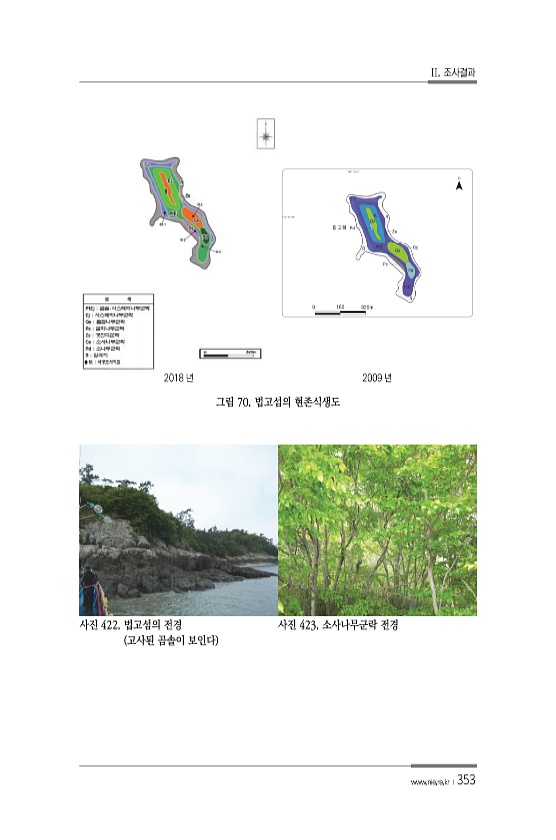 II. 조사결과 www.nie.re.kr ?353 2018 년 2009 년 그림 70. 법고섬의 현존식생도 사진 422. 법고섬의 전경 고사된 곰솔이 보인다 사진 423. 소사나무군락전경