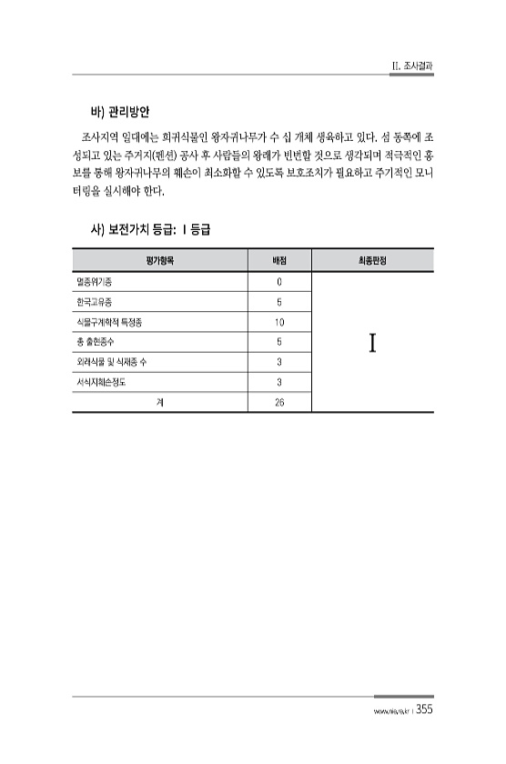 II. 조사결과 www.nie.re.kr ?355 조사지역 일대에는 희귀식물인 왕자귀나무가 수 십 개체 생육하고 있다. 섬 동쪽에 조 성되고 있는 주거지 펜션 공사 후 사람들의 왕래가 빈번할 것으로 생각되며 적극적인 홍 보를 통해 왕자귀나무의 훼손이 최소화할 수 있도록 보호조치가 필요하고 주기적인 모니 터링을 실시해야 한다. 평가항목 배점 최종판정 멸종위기종 0 Ⅰ 한국고유종 5 식물구계학적 특정종 10 총 출현종수 5 외래식물 및 식재종 수 3 서식지훼손정도 3 계26