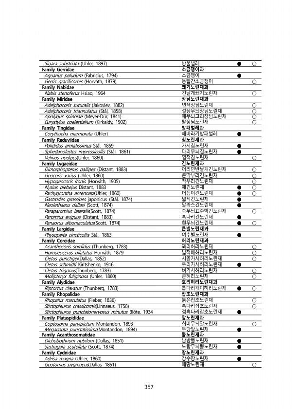 357 Sigara substriata Uhler, 1897 방물벌레 ● ○ Family Gerridae 소금쟁이과 Aquarius paludum Fabricius, 1794 소금쟁이 ● Gerris gracilicornis Horv?th, 1879 등빨간소금쟁이 ○ Family Nabidae 쐐기노린재과 Nabis stenoferus Hsiao, 1964 긴날개쐐기노린재 ○ Family Miridae 장님노린재과 Adelphocoris suturalis Jakovlev, 1882 변색장님노린재 ○ Adelphocoris triannulatus St?l, 1858 설상무늬장님노린재 ○ Apolygus spinolae Meyer-D?r, 1841 애무늬고리장님노린재 ○ Eurystylus coelestiali...