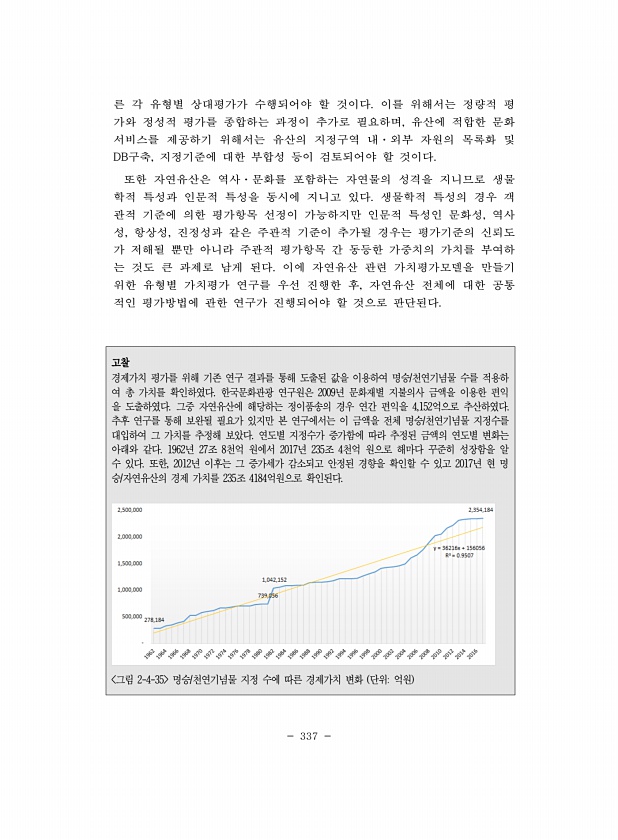 337 른 각 유형별 상대평가가 수행되어야 할 것이다. 이를 위해서는 정량적 평 가와 정성적 평가를 종합하는 과정이 추가로 필요하며, 유산에 적합한 문화 서비스를 제공하기 위해서는 유산의 지정구역 내·외부 자원의 목록화 및 DB구축, 지정기준에 대한 부합성 등이 검토되어야 할 것이다. 또한 자연유산은 역사·문화를 포함하는 자연물의 성격을 지니므로 생물 학적 특성과 인문적 특성을 동시에 지니고 있다. 생물학적 특성의 경우 객 관적 기준에 의한 평가항목 선정이 가능하지만 인문적 특성인 문화성, 역사 성, 항상성, 진정성과 같은 주관적 기준이 추가될 경우는 평가기준의 신뢰도 가 저해될 뿐만 아니라 주관적 평가항목 간 동등한 가중치의 가치를 부여하 는 것도 큰 과제로 남게 된다. 이에 자연유산 관련 가치평가모델을 ...