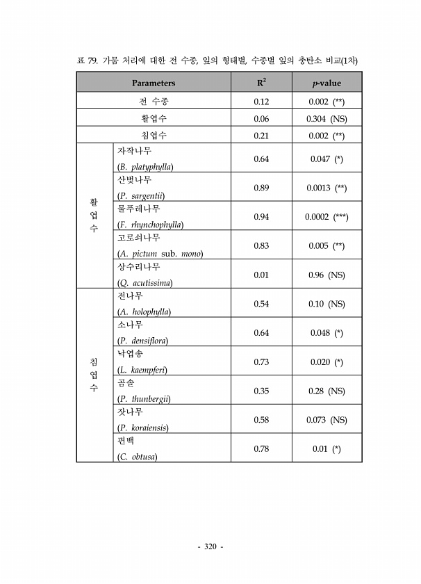 320 Parameters R2 p-value 전 수종 0.12 0.002 ** 활엽수 0.06 0.304 NS 침엽수 0.21 0.002 ** 활 엽 수 자작나무 B. platyphylla 0.64 0.047 * 산벚나무 P. sargentii 0.89 0.0013 ** 물푸레나무 F. rhynchophylla 0.94 0.0002 *** 고로쇠나무 A. pictum sub. mono 0.83 0.005 ** 상수리나무 Q. acutissima 0.01 0.96 NS 침 엽 수 전나무 A. holophylla 0.54 0.10 NS 소나무 P. densiflora 0.64 0.048 * 낙엽송 L. kaempferi 0.73 0.020 * 곰솔 P. thunbergii 0.35 0.28 NS 잣나무 P. ...