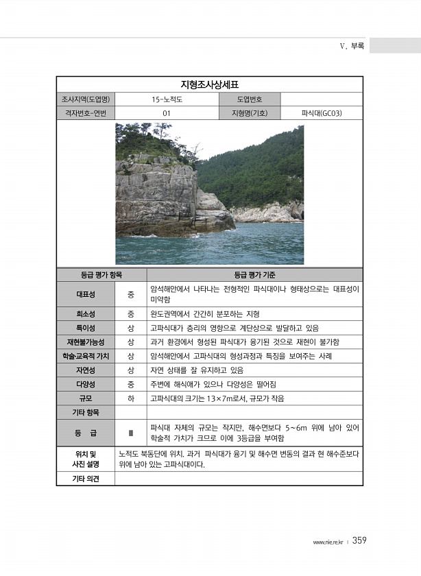 Ⅴ. 부록 www.nie.re.kr ? 359 지형조사상세표 조사지역 도엽명 15-노적도 도엽번호 격자번호-연번 01 지형명 기호 파식대 GC03 등급 평가 항목 등급 평가 기준 대표성 중 암석해안에서 나타나는 전형적인 파식대이나 형태상으로는 대표성이 미약함 희소성 중 완도권역에서 간간히 분포하는 지형 특이성 상 고파식대가 층리의 영향으로 계단상으로 발달하고 있음 재현불가능성 상 과거 환경에서 형성된 파식대가 융기된 것으로 재현이 불가함 학술?교육적 가치 상 암석해안에서 고파식대의 형성과정과 특징을 보여주는 사례 자연성 상 자연 상태를 잘 유지하고 있음 다양성 중 주변에 해식애가 있으나 다양성은 떨어짐 규모 하 고파식대의 크기는 13×7m로서, 규모가 작음 기타 항목 등 급 Ⅲ 파식대 자체의 규모는 작지만,...