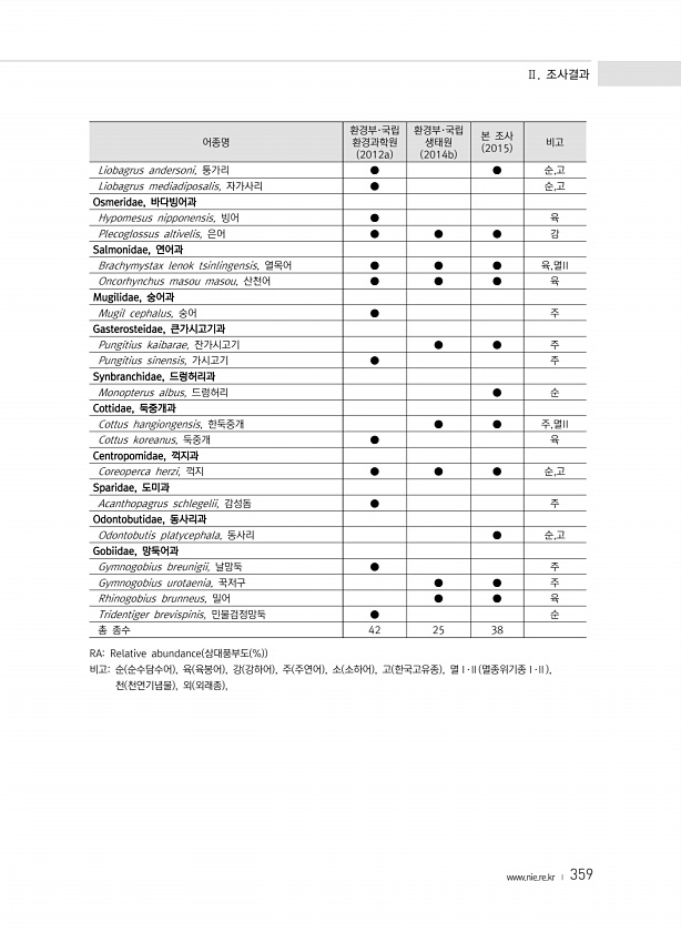 Ⅱ. 조사결과 www.nie.re.kr ? 359 어종명 환경부·국립 환경과학원 2012a 환경부·국립 생태원 2014b 본 조사 2015 비고 Liobagrus andersoni, 퉁가리 ● ● 순,고 Liobagrus mediadiposalis, 자가사리 ● 순,고 Osmeridae, 바다빙어과 Hypomesus nipponensis, 빙어 ● 육 Plecoglossus altivelis, 은어 ● ● ● 강 Salmonidae, 연어과 Brachymystax lenok tsinlingensis, 열목어 ● ● ● 육,멸II Oncorhynchus masou masou, 산천어 ● ● ● 육 Mugilidae, 숭어과 Mugil cephalus, 숭어 ● 주 Gasterosteidae, 큰가시고기과 Pu...