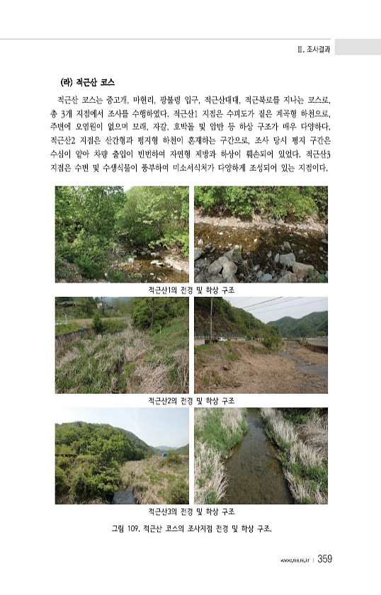 Ⅱ. 조사결과 www.nie.re.kr ? 359 라 적근산 코스 적근산 코스는 중고개, 마현리, 광불령 입구, 적근산대대, 적근북로를 지나는 코스로, 총 3개 지점에서 조사를 수행하였다. 적근산1 지점은 수피도가 짙은 계곡형 하천으로, 주변에 오염원이 없으며 모래, 자갈, 호박돌 및 암반 등 하상 구조가 매우 다양하다. 적근산2 지점은 산간형과 평지형 하천이 혼재하는 구간으로, 조사 당시 평지 구간은 수심이 얕아 차량 출입이 빈번하여 자연형 제방과 하상이 훼손되어 있었다. 적근산3 지점은 수변 및 수생식물이 풍부하여 미소서식처가 다양하게 조성되어 있는 지점이다. 적근산1의 전경 및 하상 구조 적근산2의 전경 및 하상 구조 적근산3의 전경 및 하상 구조 그림 109. 적근산 코스의 조사지점 전경 및 하상구조...