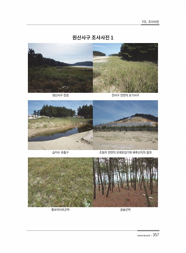 VII. 조사사진 www.nie.re.kr ?357 원산사구 전경 전사구 전면의 초기사구 습지수 유출구 조림지 전면의 모래포집기와 배후산지의 절개 통보리사초군락 곰솔군락1