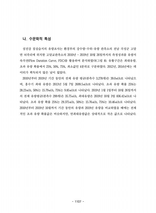 1107 나. 수문학적 특성 섬진강 침실습지의 유량조사는 환경부의 강수량?수위?유량 관측소의 전남 곡성군 고달 면 뇌죽리에 위치한 고달교관측소의 2010년 2019년 10월 26일까지의 측정성과를 유량지 속곡선 Flow Duration Curve, FDC 를 활용하여 분석하였다 그림 8 유황구간은 최대유량, 초과 유량 확률에서 25%, 50%, 75%, 최소값인 4분위로 구분하였다. 2012년, 2014년에는 데 이터가 획득되지 않은 날이 많았다. 2010년부터 2019년 기간 동안의 전체 유량 평균 관측수 3,278개 은 39.0㎥/s로 나타났으 며, 홍수기 최대 유량은 2013년 5월 7일 2699.5㎥/s로 나타났다. 초과 유량 확률 25%는 28.23㎥/s, 50%는 15.79㎥/s, 75%는 9.8...