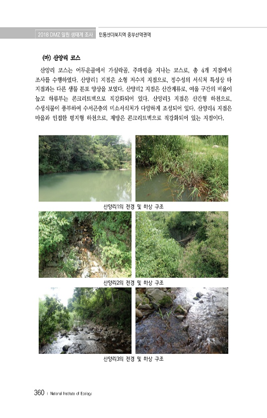 2018 DMZ 일원 생태계 조사 민통선이북지역 중부산악권역 360 ? National Institute of Ecology 산양리1의 전경 및 하상 구조 산양리2의 전경 및 하상 구조 산양리3의 전경 및 하상 구조 마 산양리 코스 산양리 코스는 어두운골에서 가실락골, 주파령을 지나는 코스로, 총 4개 지점에서 조사를 수행하였다. 산양리1 지점은 소형 저수지 지점으로, 정수성의 서식처 특성상 타 지점과는 다른 생물 분포 양상을 보였다. 산양리2 지점은 산간계류로, 여울 구간의 비율이 높고 하류부는 콘크리트벽으로 직강화되어 있다. 산양리3 지점은 산간형 하천으로, 수생식물이 풍부하여 수서곤충의 미소서식처가 다양하게 조성되어 있다. 산양리4 지점은 마을과 인접한 평지형 하천으로, 제방은 콘크리트벽으로 직강화되어...