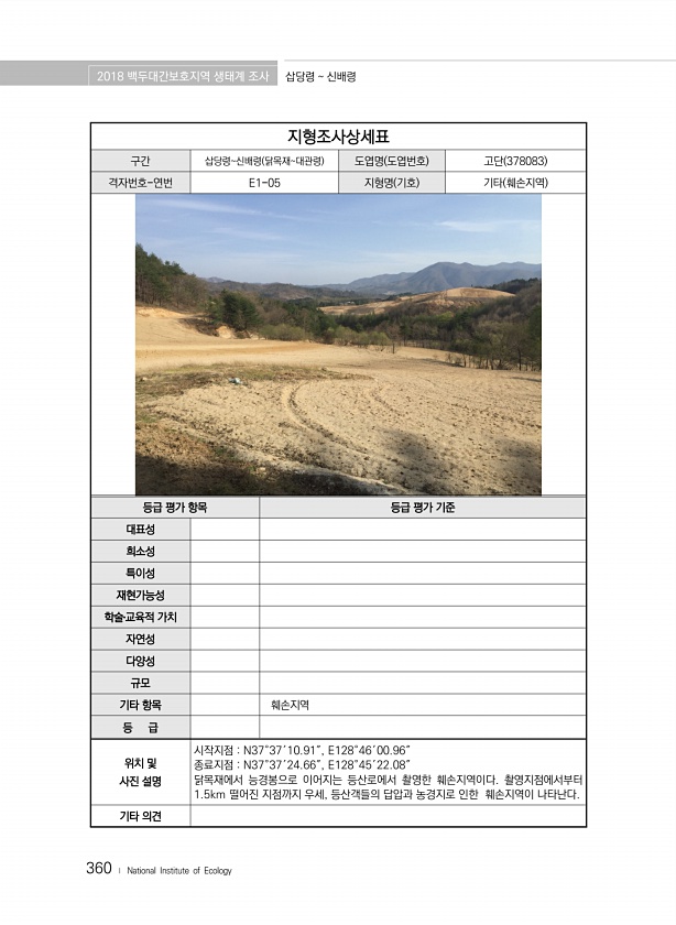 2018 백두대간보호지역 생태계 조사 삽당령 신배령 360 ? National Institute of Ecology 지형조사상세표 구간 삽당령신배령 닭목재대관령 도엽명 도엽번호 고단 378083 격자번호-연번 E1-05 지형명 기호 기타 훼손지역 등급 평가 항목 등급 평가 기준 대표성 희소성 특이성 재현가능성 학술?교육적 가치 자연성 다양성 규모 기타 항목 훼손지역 등 급 위치 및 사진 설명 시작지점 N37°37′10.91″, E128°46′00.96″ 종료지점 N37°37′24.66″, E128°45′22.08″ 닭목재에서 능경봉으로 이어지는 등산로에서 촬영한 훼손지역이다. 촬영지점에서부터 1.5km 떨어진 지점까지 우세, 등산객들의 답압과 농경지로 인한 훼손지역이 나타난다. 기타의견