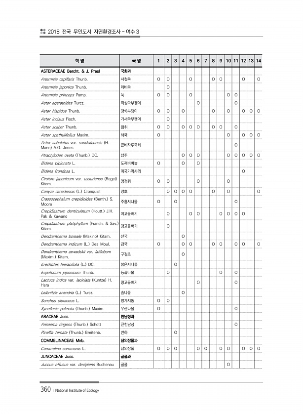 2018 전국 무인도서 자연환경조사 여수 3 360 ? National Institute of Ecology 학 명 국 명 1 2 3 4 5 6 7 8 9 10 11 12 13 14 ASTERACEAE Bercht. & J. Presl 국화과 Artemisia capillaris Thunb. 사철쑥 O O O O O O O Artemisia japonica Thunb. 제비쑥 O Artemisia princeps Pamp. 쑥 O O O O O Aster ageratoides Turcz. 까실쑥부쟁이 O O Aster hispidus Thunb. 갯쑥부쟁이 O O O O O O O O Aster incisus Fisch. 가새쑥부쟁이 O Aster scaber Thunb. 참취 O O O O O O O O ...