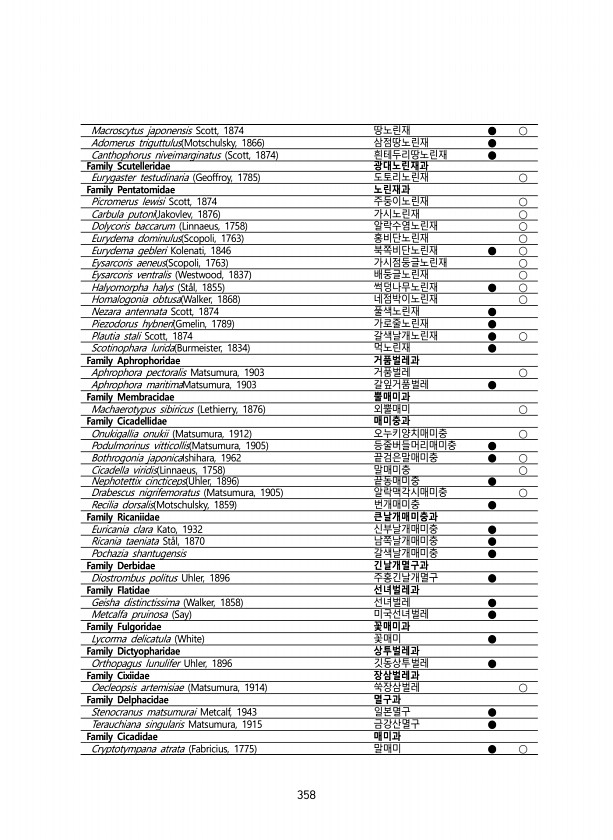 358 Macroscytus japonensis Scott, 1874 땅노린재 ● ○ Adomerus triguttulus Motschulsky, 1866 삼점땅노린재 ● Canthophorus niveimarginatus Scott, 1874 흰테두리땅노린재 ● Family Scutelleridae 광대노린재과 Eurygaster testudinaria Geoffroy, 1785 도토리노린재 ○ Family Pentatomidae 노린재과 Picromerus lewisi Scott, 1874 주둥이노린재 ○ Carbula putoni Jakovlev, 1876 가시노린재 ○ Dolycoris baccarum Linnaeus, 1758 알락수염노린재 ○ Eurydema dominulus Scopoli, 17...