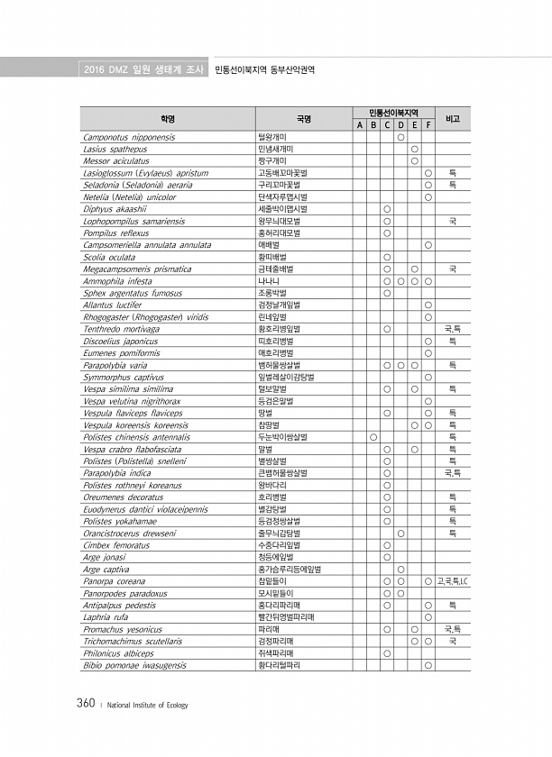 2016 DMZ 일원 생태계 조사 민통선이북지역 동부산악권역 360 ? National Institute of Ecology 학명 국명 민통선이북지역 비고 A B C D E F Camponotus nipponensis 털왕개미 ○ Lasius spathepus 민냄새개미 ○ Messor aciculatus 짱구개미 ○ Lasioglossum Evylaeus apristum 고동배꼬마꽃벌 ○ 특 Seladonia Seladonia aeraria 구리꼬마꽃벌 ○ 특 Netelia Netelia unicolor 단색자루맵시벌 ○ Diphyus akaashii 세줄박이맵시벌 ○ Lophopompilus samariensis 왕무늬대모벌 ○ 국 Pompilus reflexus 홍허리대모벌 ○ Campsomeriell...