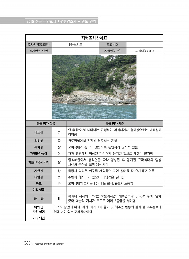 2015 전국 무인도서 자연환경조사 완도 권역 360 ? National Institute of Ecology 지형조사상세표 조사지역 도엽명 15-노적도 도엽번호 격자번호-연번 02 지형명 기호 파식대 GC03 등급 평가 항목 등급 평가 기준 대표성 중 암석해안에서 나타나는 전형적인 파식대이나 형태상으로는 대표성이 미약함 희소성 중 완도권역에서 간간히 분포하는 지형 특이성 상 고파식대가 층리의 영향으로 완만하게 경사져 있음 재현불가능성 상 과거 환경에서 형성된 파식대가 융기된 것으로 재현이 불가함 학술?교육적 가치 상 암석해안에서 층리면을 따라 형성된 후 융기된 고파식대의 형성 과정과 특징을 보여주는 사례 자연성 상 폭풍시 밀려온 어구를 제외하면 자연 상태를 잘 유지하고 있음 다양성 중 주변에 해식애가 있으...