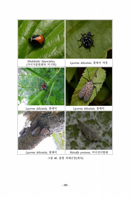 350 Hindoloides bipunctatus, 가시거품벌레과 미기록 Lycorma delicatula, 꽃매미 약충 Lycorma delicatula, 꽃매미 Lycorma delicatula, 꽃매미 Lycorma delicatula, 꽃매미 Metcalfa pruinosa, 미국선녀벌레 그림 40. 출현 외래곤충 계속