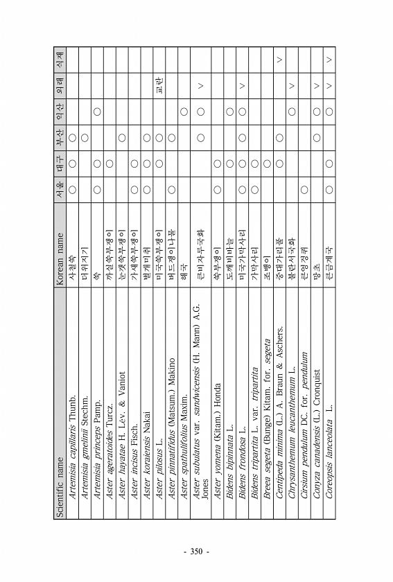 Scientific name Korean name 서울 대구 부산 익산 외래 식재 Artemisia capillaris Thunb. 사철쑥 ○ ○ ○ Artemisia gmelinii Stechm. 더위지기 ○ Artemisia princeps Pamp. 쑥 ○ ○ ○ Aster ageratoides Turcz. 까실쑥부쟁이 ○ Aster hayatae H. L?v. & Vaniot 눈갯쑥부쟁이 ○ Aster incisus Fisch. 가새쑥부쟁이 ○ ○ Aster koraiensis Nakai 벌개미취 ○ ○ ○ Aster pilosus L. 미국쑥부쟁이 ○ ○ 교란 Aster pinnatifidus Matsum. Makino 버드쟁이나물 ○ ○...