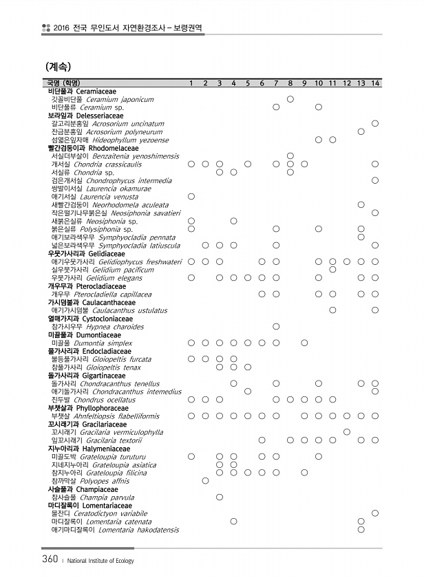 2016 전국 무인도서 자연환경조사 보령권역 360 ? National Institute of Ecology 계속 국명 학명 1 2 3 4 5 6 7 8 9 10 11 12 13 14 비단풀과 Ceramiaceae 깃꼴비단풀 Ceramium japonicum ? 비단풀류 Ceramium sp. ? ? 보라잎과 Delesseriaceae 갈고리분홍잎 Acrosorium uncinatum ? 잔금분홍잎 Acrosorium polyneurum ? 섬엷은잎자매 Hideophyllum yezoense ? ? 빨간검둥이과 Rhodomelaceae 서실더부살이 Benzaitenia yenoshimensis ? 개서실 Chondria crassicaulis ? ? ? ? ? ? ? ? 서실류 Chondria sp. ? ?...