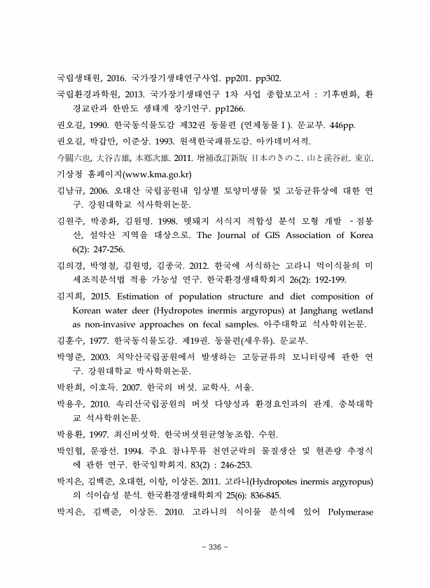 국립생태원, 2016. 국가장기생태연구사업. pp201. pp302. 국립환경과학원, 2013. 국가장기생태연구 1차 사업 종합보고서 기후변화, 환 경교란과 한반도 생태계 장기연구. pp1266. 권오길, 1990. 한국동식물도감 제32권 동물편 연체동물Ⅰ 문교부. 446pp. 권오길, 박갑만, 이준상. 1993. 원색한국패류도감. 아카데미서적. 今關六也, 大谷吉雄, 本鄕次雄. 2011. 增補改訂新版 日本のきのこ. 山と溪谷社. 東京. 기상청 홈페이지 www.kma.go.kr 김남규, 2006. 오대산 국립공원내 임상별 토양미생물 및 고등균류상에 대한 연 구. 강원대학교 석사학위논문. 김원주, 박종화, 김원명. 1998. 멧돼지 서식지 적합성 분석 모형 개발 ?점봉 산, 설악산 지역을 대상으로. The Jou...