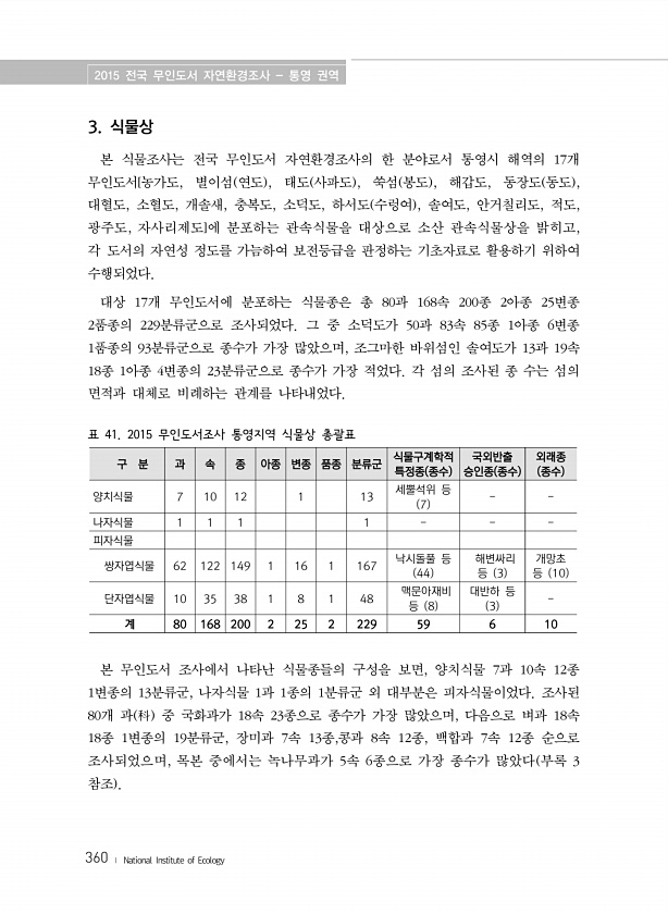 2015 전국 무인도서 자연환경조사 통영 권역 360 ? National Institute of Ecology 3. 식물상 본 식물조사는 전국 무인도서 자연환경조사의 한 분야로서 통영시 해역의 17개 무인도서[농가도, 별이섬 연도 , 태도 사파도 , 쑥섬 봉도 , 해갑도, 동장도 동도 , 대혈도, 소혈도, 개솔새, 충복도, 소덕도, 하서도 수렁여 , 솔여도, 안거칠리도, 적도, 광주도, 자사리제도]에 분포하는 관속식물을 대상으로 소산 관속식물상을 밝히고, 각 도서의 자연성 정도를 가늠하여 보전등급을 판정하는 기초자료로 활용하기 위하여 수행되었다. 대상 17개 무인도서에 분포하는 식물종은 총 80과 168속 200종 2아종 25변종 2품종의 229분류군으로 조사되었다. 그 중 소덕도가 50과 83속 85종 1...