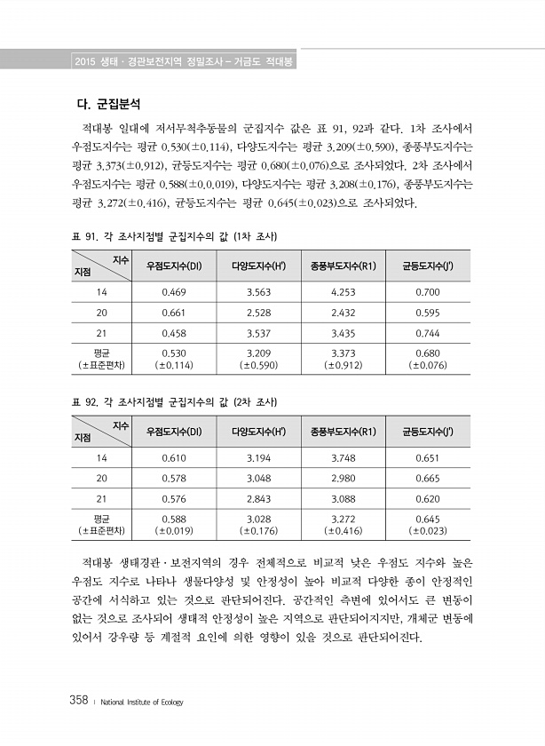 2015 생태·경관보전지역 정밀조사 거금도 적대봉 358 ? National Institute of Ecology 다. 군집분석 적대봉 일대에 저서무척추동물의 군집지수 값은 표 91, 92과 같다. 1차 조사에서 우점도지수는 평균 0.530 ±0.114 , 다양도지수는 평균 3.209 ±0.590 , 종풍부도지수는 평균 3.373 ±0.912 , 균등도지수는 평균 0.680 ±0.076 으로 조사되었다. 2차 조사에서 우점도지수는 평균 0.588 ±0.0.019 , 다양도지수는 평균 3.208 ±0.176 , 종풍부도지수는 평균 3.272 ±0.416 , 균등도지수는 평균 0.645 ±0.023 으로 조사되었다. 지수 지점 우점도지수 DI 다양도지수 H종풍부도지수 R1 균등도지수 J14 0.469 3.563...