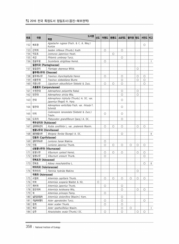 2016 전국 특정도서 정밀조사 옹진-북부권역 358 ? National Institute of Ecology 번호 국명 도서명 학명 신도 어평도 뭉퉁도 소초지도 할미염 항도 서만도 비고 152 배초향 Agastache rugosa Fisch. & C. A. Mey. Kuntze ○ 153 산박하 Isodon inflexus Thunb. Kud? ○ ○ 154 익모초 Leonurus japonicus Houtt. ○ 155 속단 Phlomis umbrosa Turcz. ○ 156 참골무꽃 Scutellaria strigillosa Hemsl. ○ Ⅰ 질경이과 Plantaginaceae 157 털질경이 Pl...