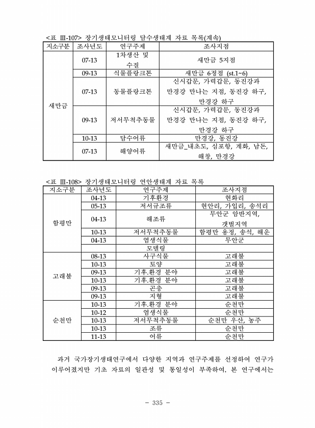 335 표 Ⅲ-107 장기생태모니터링 담수생태계 자료 목록 계속 지소구분 조사년도 연구주제 조사지점 새만금 07-13 1차생산 및 수질 새만금 5지점 09-13 식물플랑크톤 새만금 6정점 st.16 07-13 동물플랑크톤 신시갑문, 가력갑문, 동진강과 만경강 만나는 지점, 동진강 하구, 만경강 하구 09-13 저서무척추동물 신시갑문, 가력갑문, 동진강과 만경강 만나는 지점, 동진강 하구, 만경강 하구 10-13 담수어류 만경강, 동진강 07-13 해양어류 새만금_내초도, 심포항, 계화, 남돈, 해창, 만경강 표 Ⅲ-108 장기생태모니터링 연안생태계 자료 목록 지소구분 조사년도 연구주제 조사지점 함평만 04-13 기후환경 현화리 05-13 저서규조류 현안리, 가입리, 송석리 04-13 해조류 무안군 암반지역,...