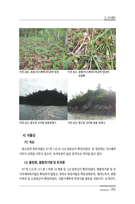 II. 조사결과 www.nie.re.kr ?355 사진 430. 곰솔-사스레피나무군락 임상 사진 431. 곰솔-사스레피나무군락 임상의 보춘화 사진 432. 법고섬 고사된 곰솔전경-1 사진 433. 법고섬 고사된 곰솔 전경-2 4 법고섬의 관속식물은 57 과 113 속 122 분류군이 확인되었다. 섬 정상에는 사스레피 나무가 군락을 이루고 있으며, 호자덩굴이 넓은 면적으로 바닥을 덮고 있다. , 57 과 113 속 111 종 1 아종 10 변종 등 122 분류군이 확인되었다. 멸종위기종 및 국 가적색목록식물은 확인되지 않았고, 한반도 특산식물은 백운산원추리, 새끼노루귀, 좀땅 비싸리 등 3 분류군이 확인되었다. 식물구계학적 특정식물 Ⅲ등급 감탕나무,모새나무,