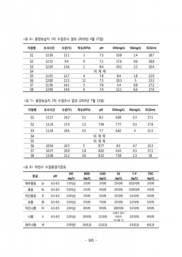 345 지점명 조사시간 수온 ℃ 탁도 NTU pH DO mg/L SS mg/L EC S/m S1 1230 12.1 1 7.3 10.8 1.4 18.7 S2 1215 9.4 0 7.1 17.6 0.6 18.8 S3 1220 13.6 1 8.4 10.2 2.2 10.4 S4 미 계 측 S5 1155 12.7 4 7.8 8.4 1.8 12.9 S6 1200 11.5 11 7.5 10.3 5 13.3 S7 1136 14.3 3 7.8 5.4 0.8 17.2 S8 1240 14.9 6 7.4 12.1 6.6 17.6 표 6 용양보습지 차 수질조사 결과 년 월 일 1 2019 4 27 지점명 조사시간 수온 ℃ 탁도 NTU pH DO mg/L SS mg/L EC S/m S1 1117 24.2 5.1 8.3 6.69 5....