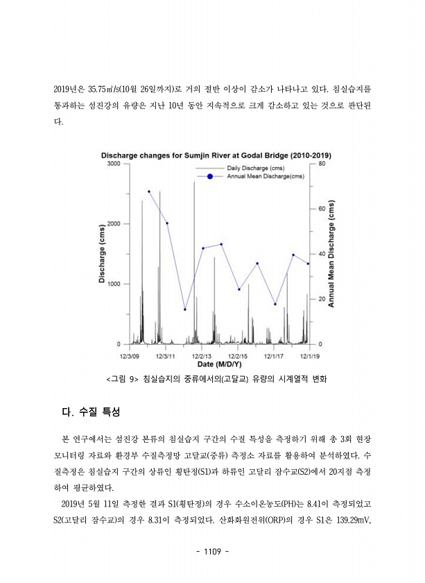 1109 2019년은 35.75㎥/s 10월 26일까지 로 거의 절반 이상이 감소가 나타나고 있다. 침실습지를 통과하는 섬진강의 유량은 지난 10년 동안 지속적으로 크게 감소하고 있는 것으로 판단된 다. 그림 9 침실습지의 중류에서의 고달교 유량의 시계열적 변화 다. 수질 특성 본 연구에서는 섬진강 본류의 침실습지 구간의 수질 특성을 측정하기 위해 총 3회 현장 모니터링 자료와 환경부 수질측정망 고달교 중류 측정소 자료를 활용하여 분석하였다. 수 질측정은 침실습지 구간의 상류인 횡탄정 S1 과 하류인 고달리 잠수교 S2 에서 20지점 측정 하여 평균하였다. 2019년 5월 11일 측정한 결과 S1 횡탄정 의 경우 수소이온농도 PH 는 8.41이 측정되었고 S2 고달리 잠수교 의 경우 8.31이 측정되었다. ...