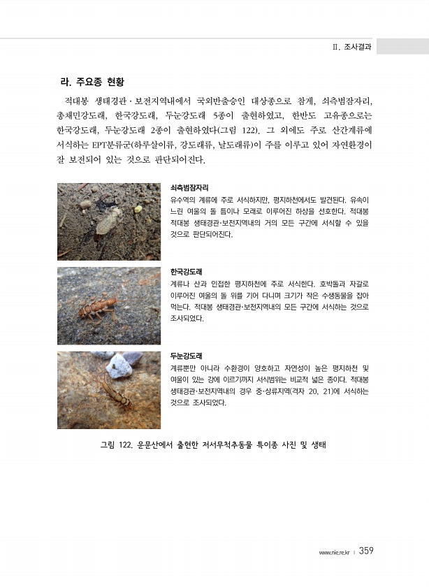 Ⅱ. 조사결과 www.nie.re.kr ? 359 라. 주요종 현황 적대봉 생태경관·보전지역내에서 국외반출승인 대상종으로 참게, 쇠측범잠자리, 총채민강도래, 한국강도래, 두눈강도래 5종이 출현하였고, 한반도 고유종으로는 한국강도래, 두눈강도래 2종이 출현하였다 그림 122 그 외에도 주로 산간계류에 서식하는 EPT분류군 하루살이류, 강도래류, 날도래류 이 주를 이루고 있어 자연환경이 잘 보전되어 있는 것으로 판단되어진다. 쇠측범잠자리 유수역의 계류에 주로 서식하지만, 평지하천에서도 발견된다. 유속이 느린 여울의 돌 틈이나 모래로 이루어진 하상을 선호한다. 적대봉 적대봉 생태경관·보전지역내의 거의 모든 구간에 서식할 수 있을 것으로 판단되어진다. 한국강도래 계류나 산과 인접한 평지하천에 주로 서식한다. 호박돌...
