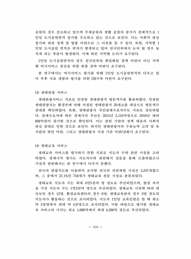 339 공원의 경우 감소하고 있으며 주제공원과 생활 공원의 증가가 전체적으로 1 인당 도시공원면적 증가를 주도하고 있는 것으로 보인다. 이는 사회적 관심 증가와 관련 정책 및 법률 마련으로 그 이유를 들 수 있다. 또한, 지역별 1 인당 도시공원 면적은 편차가 발생되고 있어 전국단위에서 논의 될 경우 놓 치게 되는 부분이 발생한다. 이에 따른 지역별 논의가 요구된다. 1인당 도시공원면적의 경우 전국단위의 획일화된 정책 마련이 아닌 지역 별 여가서비스 증진을 위한 맞춤 전략 마련이 요구된다. 본 연구에서는 여가서비스 평가를 위해 1인당 도시공원면적만 다루고 있 어 추후 지표 개발과 평가를 위한 DB구축 마련이 요구된다. 3 생태관광 서비스 생태관광서비스 지표로 인증된 생태관광지 방문객수를 활용하였다. 인증된 ...