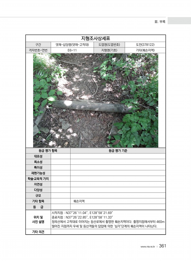 Ⅲ. 부록 www.nie.re.kr ? 361 지형조사상세표 구간 댓재삽당령 댓재고적대 도엽명 도엽번호 도전 378122 격자번호-연번 E6-11 지형명 기호 기타 훼손지역 등급 평가 항목 등급 평가 기준 대표성 희소성 특이성 재현가능성 학술?교육적 가치 자연성 다양성 규모 기타 항목 훼손지역 등 급 위치 및 사진 설명 시작지점 N37°26′11.04″, E128°58′21.69″ 종료지점 N37°26′22.85″, E128°58′11.33″ 청옥산에서 고적대로 이어지는 등산로에서 촬영한 훼손지역이다. 촬영지점에서부터 460m 떨어진 지점까지 우세 및 등산객들의 답압에 의한 ‘심각’단계의 훼손지역이 나타난다. 기타의견