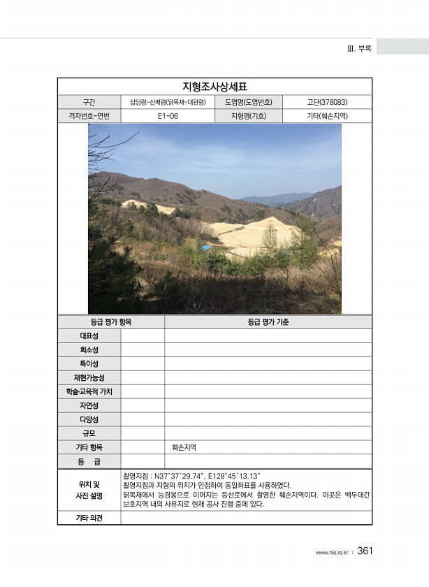 Ⅲ. 부록 www.nie.re.kr ? 361 지형조사상세표 구간 삽당령신배령 닭목재대관령 도엽명 도엽번호 고단 378083 격자번호-연번 E1-06 지형명 기호 기타 훼손지역 등급 평가 항목 등급 평가 기준 대표성 희소성 특이성 재현가능성 학술?교육적 가치 자연성 다양성 규모 기타 항목 훼손지역 등 급 위치 및 사진 설명 촬영지점 N37°37′29.74″, E128°45′13.13″ 촬영지점과 지형의 위치가 인접하여 동일좌표를 사용하였다. 닭목재에서 능경봉으로 이어지는 등산로에서 촬영한 훼손지역이다. 이곳은 백두대간 보호지역 내의 사유지로 현재 공사 진행 중에 있다. 기타의견