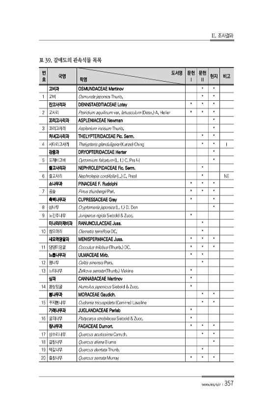 II. 조사결과 www.nie.re.kr ?357 번 호 국명 도서명 학명 문헌 Ⅰ 문헌 Ⅱ 현지 비고 고비과 OSMUNDACEAE Martinov * * 1 고비 Osmunda japonica Thunb. * * 잔고사리과 DENNSTAEDTIACEAE Lotsy * * * 2 고사리 Pteridium aquilinum var. latiusculum Desv. A. Heller * * * 꼬리고사리과 ASPLENIACEAE Newman * 3 꼬리고사리 Asplenium incisum Thunb. * 처녀고사리과 THELYPTERIDACEAE Pic. Serm. * * 4 사다리고사리 Thelypteris glanduligera Kunze Ching * * Ⅰ 관중과 DRYOPTERIDACEAE Herte...