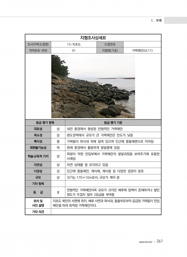 Ⅴ. 부록 www.nie.re.kr ? 361 지형조사상세표 조사지역 도엽명 15-지초도 도엽번호 격자번호-연번 01 지형명 기호 거력해안 GC11 등급 평가 항목 등급 평가 기준 대표성 상 내만 환경에서 형성된 전형적인 거력해안 희소성 상 완도권역에서 규모가 큰 거력해안은 빈도가 낮음 특이성 중 거력들이 파식대 위에 덮여 있으며 인근에 몽돌해변으로 이어짐 재현불가능성 하 현재 환경에서 활발하게 발달중에 있음 학술?교육적 가치 상 파랑이 약한 만입부에서 거력해안의 발달과정을 보여주기에 유용한 사례임 자연성 상 자연 상태를 잘 유지하고 있음 다양성 상 인근에 몽돌해안, 해식애, 해식동 등 다양한 경관이 분포 규모 상 크기는 170×10m로서, 규모가 매우 큼 기타 항목 등 급 Ⅱ 전형적인 거력해안이며 규모가 ...