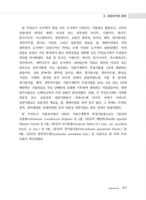 Ⅲ. 종합 분야별 총평 www.nie.re.kr ? 361 본 무인도서 조사에서 대상 모든 도서에서 나타나는 식물종은 없었으나, 교목인 곰솔 일부 바위섬 제외 , 아교목 또는 관목성인 돈나무, 사철나무, 광나무, 돌가시나무, 사스레피나무, 천선과나무, 초본인 참억새, 밀사초, 해국, 갯기름나물, 갯까치수염, 참나리, 기린초, 그리고 덩굴성인 계요등, 칡, 댕댕이덩굴은 거의 대부분의 도서에서 나타나거나 적어도 10개 이상의 도서에서 관찰되었다. 특히 곰솔은 토양이 거의 형성되지 않은 바위섬들을 제외한 모든 무인도서에서 우점종의 위치를 차지하였다. 목본 중 돈나무, 사철나무, 광나무, 돌가시나무, 사스레피나무, 천선과나무, 예덕나무가 많은 도서에서 나타났는데 이들은 대부분 아교목 또는 관목으로 남부지방에 주로 ...