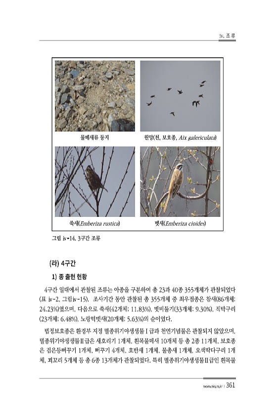 iv. 조 류 www.nie.re.kr ? 361 물떼새류 둥지 원앙 천, 보호종, Aix galericulata 쑥새 Emberiza rustica 멧새 Emberiza cioides 그림 ⅳ-14. 3구간 조류 4 1 4구간 일대에서 관찰된 조류는 아종을 구분하여 총 23과 40종 355개체가 관찰되었다 표 ⅳ-2, 그림ⅳ-15 조사기간 동안 관찰된 총 355개체 중 최우점종은 참새 86개체; 24.23% 였으며, 다음으로 쑥새 42개체; 11.83% , 멧비둘기 33개체; 9.30% , 직박구리 23개체; 6.48% , 노랑턱멧새 20개체; 5.63% 의 순이었다. 법정보호종은 환경부 지정 멸종위기야생생물Ⅰ급과 천연기념물은 관찰되지 않았으며, 멸종위기야생생물Ⅱ급은 새호리기 1개체, 흰목물떼새 10개체 ...
