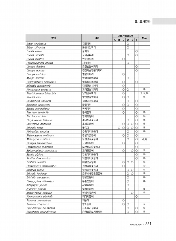 Ⅱ. 조사결과 www.nie.re.kr ? 361 학명 국명 민통선이북지역 비고 A B C D E F Bibio tenebrosus 검털파리 ○ Bibio rufiventris 붉은배털파리 ○ Lucilia caesar 금파리 ○ Lucilia sericata 구리금파리 ○ ○ Lucilia illustris 연두금파리 ○ Protocalliphora azurea 새금파리 ○ Conops flavipes 조잔벌붙이파리 ○ Conops opimus 검정가슴벌붙이파리 ○ Conops curtulus 벌붙이파리 ○ Myopa buccata 알락벌붙이파리 ○ Condylostylus nebulosus 얼룩장다리파리 ○ ○ Minettia longipennis 검정큰날개파리 ○ Homoneura euaresta 꼬마...
