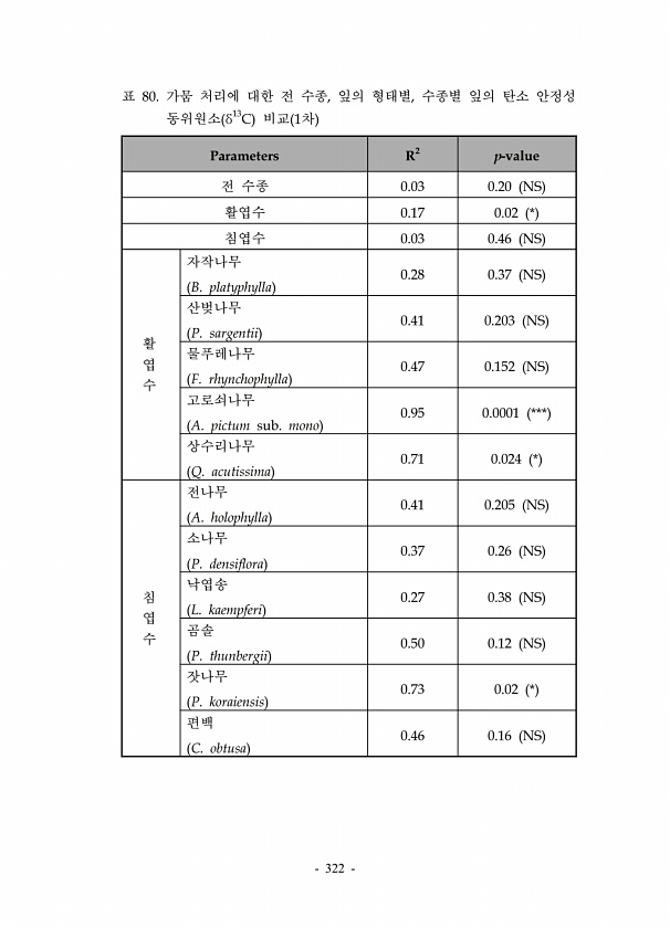 322 Parameters R2 p-value 전 수종 0.03 0.20 NS 활엽수 0.17 0.02 * 침엽수 0.03 0.46 NS 활 엽 수 자작나무 B. platyphylla 0.28 0.37 NS 산벚나무 P. sargentii 0.41 0.203 NS 물푸레나무 F. rhynchophylla 0.47 0.152 NS 고로쇠나무 A. pictum sub. mono 0.95 0.0001 *** 상수리나무 Q. acutissima 0.71 0.024 * 침 엽 수 전나무 A. holophylla 0.41 0.205 NS 소나무 P. densiflora 0.37 0.26 NS 낙엽송 L. kaempferi 0.27 0.38 NS 곰솔 P. thunbergii 0.50 0.12 NS 잣나무 P. kora...